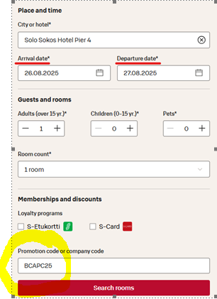 Book via a direct link to the Sokos Hotels website. The booking code is filled in automatically when you use the link below: